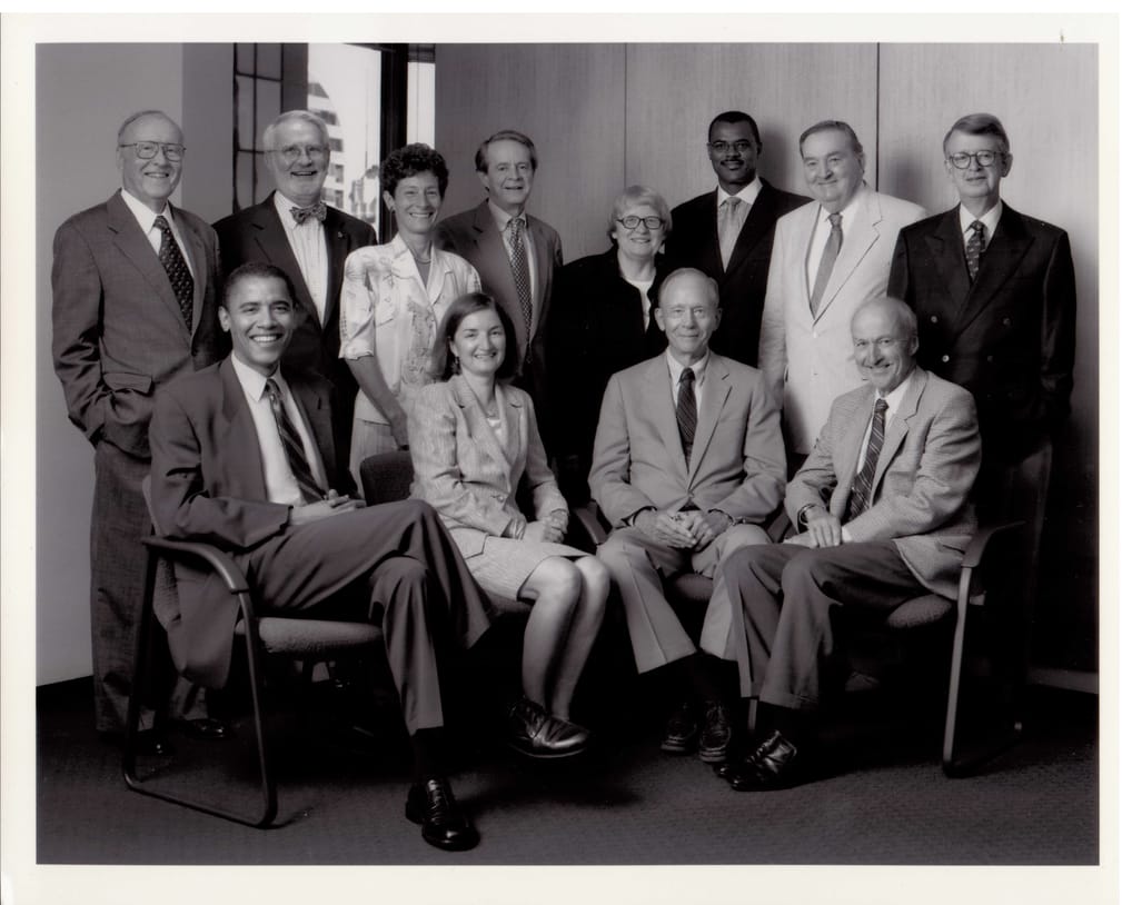 Barack Obama, a University of Chicago law school lecturer and community organizer, joins the board. (1994-2002)
