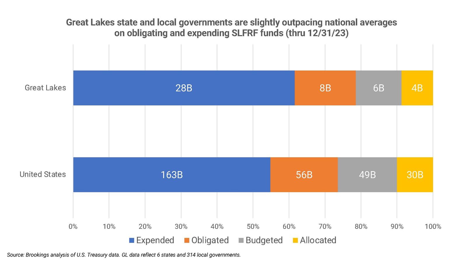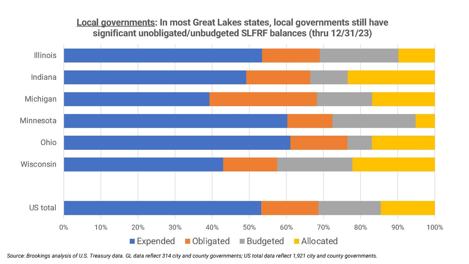 Even so, Great Lakes state and local governments are also on track to fully expend their SLFRF allocations by the deadline. At the end of 2023, they reported expending $28 billion, or 62%, of their total SLFRF allocation, well ahead of the 55% share nationwide. Halfway to the 2026 deadline, Great Lakes governments overall look well positioned thus far to fully capitalize on the opportunities the program provides.