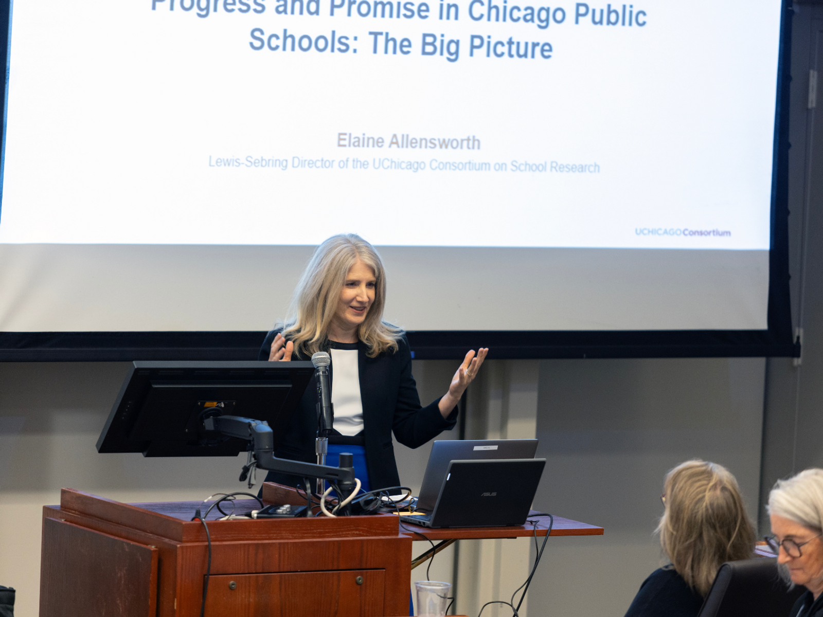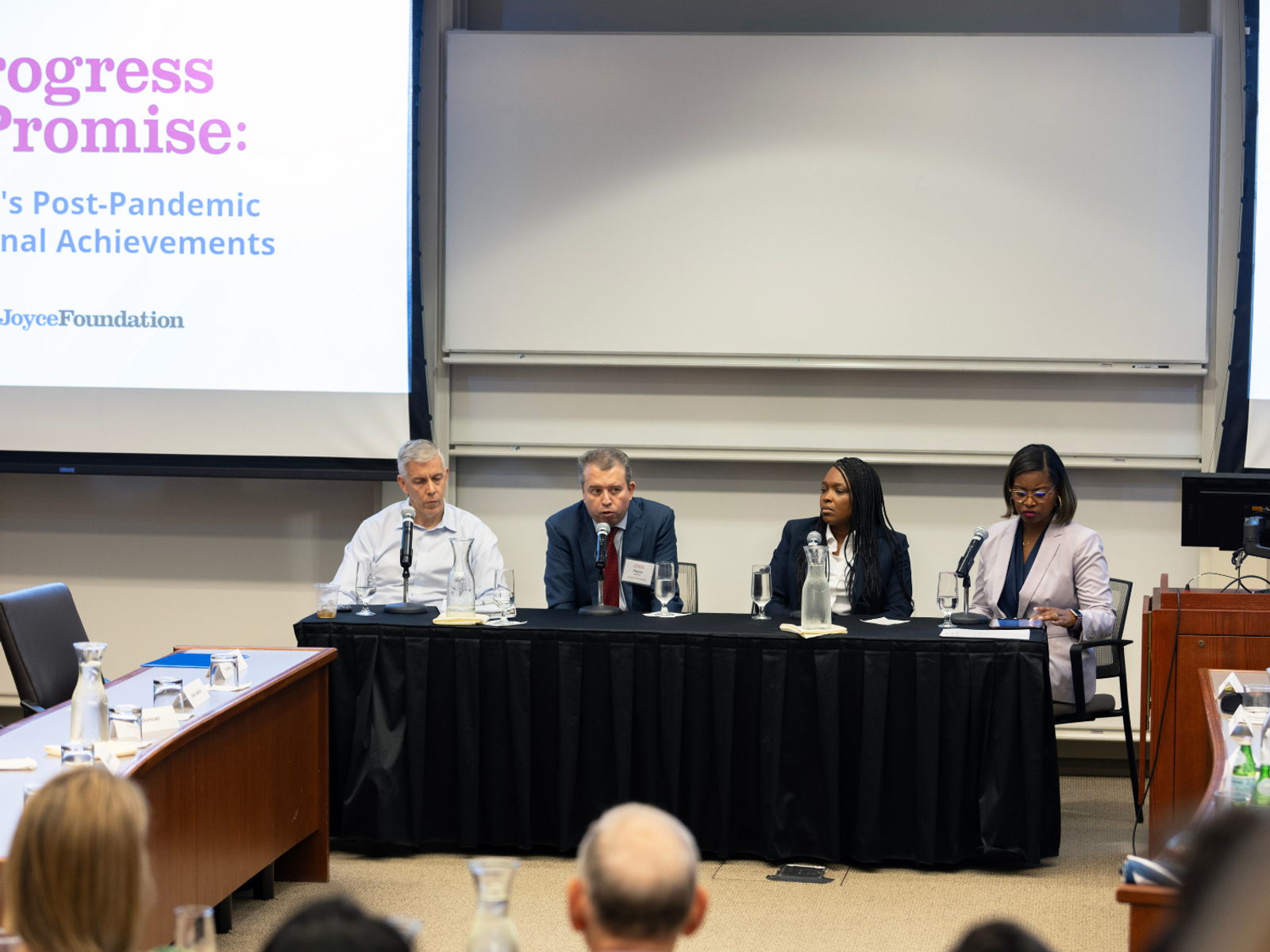 Tom Kane, the Walter H. Gale Professor of Education and Economics at Harvard Graduate School of Education, presented data from the Education Recovery Scorecard detailing progress in Chicago and across Illinois. The study shows that between 2022 and 2023, Chicago students made up about 35 percent of a grade equivalent in math after losing three-quarters of a grade equivalent during the pandemic. In reading, CPS students made enough ground to exceed their 2019 achievement level. Elaine Allensworth, the Lewis-Sebring Executive Director of the UChicago Consortium, provided context on the district's decade-long improvement in other areas, such as high school graduation and college attendance. A lively panel followed with CPS CEO Pedro Martinez and former CPS CEOs Janice K. Jackson and Arne Duncan. It was moderated by WTTW's Brandis Friedman. CEO Martinez attributed the recent post-COVID progress to additional academic interventionists, tutoring, after-school and summer programs, and academic coaches for teachers in schools with high teacher turnover.