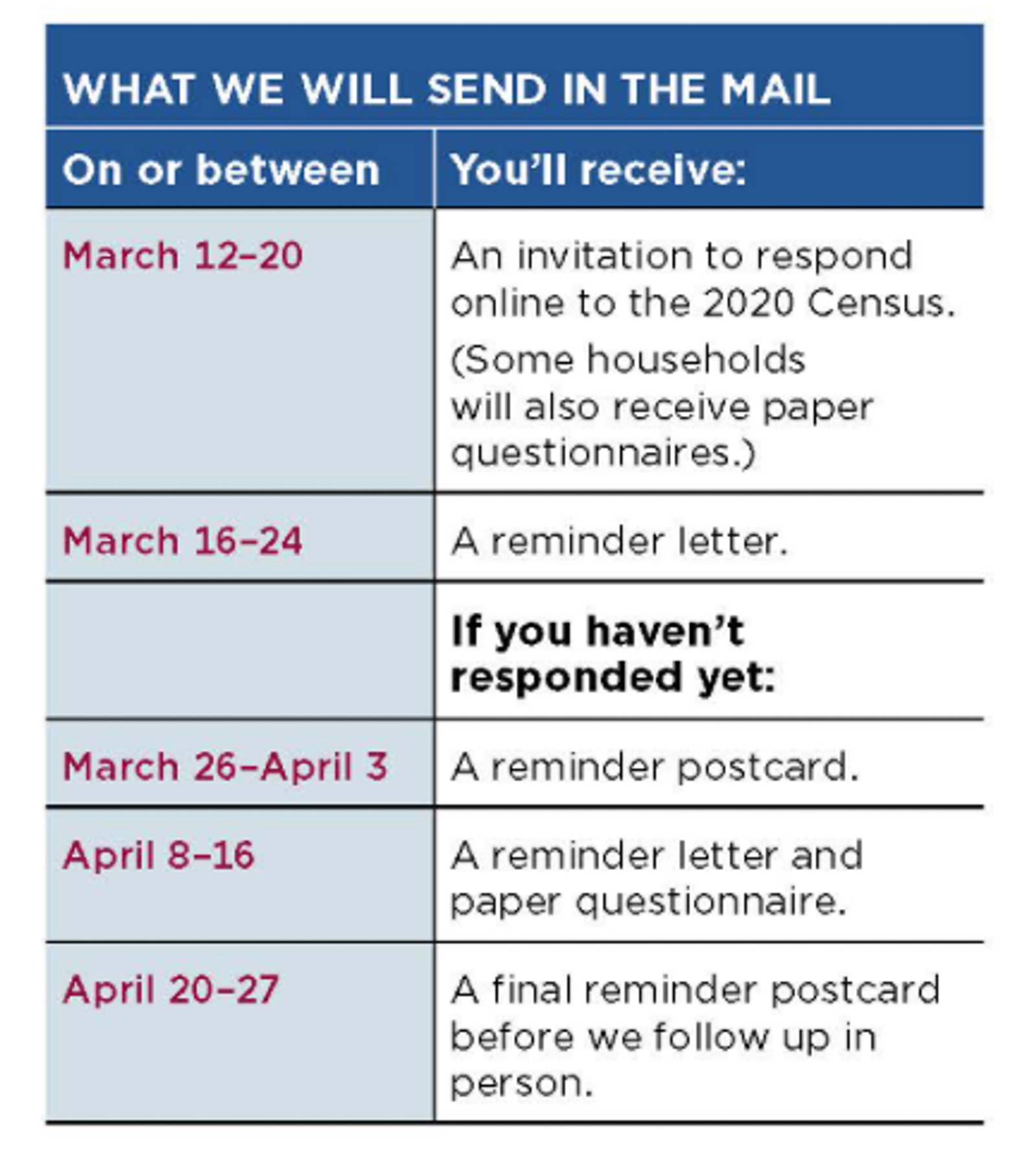 The Census Bureau will send out letters between March 12 and 20 inviting households to complete the census, and reminders will be sent throughout March and April.