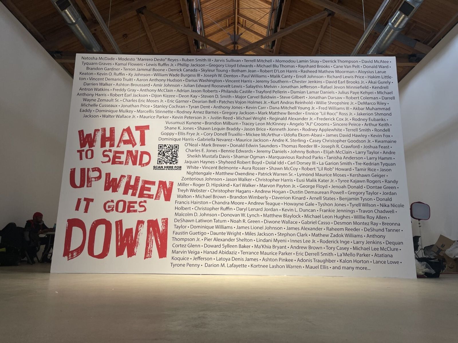 "What To Send Up When It Goes Down" by playwright Aleshea Harris is described as a "play-pageant-ritual homegoing celebration in response to the physical and spiritual deaths of Black people as a result of racialized violence." It explores themes of police brutality and other gratuitous violence that claims far too many Black lives, and seeks also to hold space for catharsis, celebration and healing. It intentionally breaks the fourth wall, blurring boundaries between performers and audiences and encouraging a communal and decidedly Black experience, where audience participation–"call-and-response"–is expected.