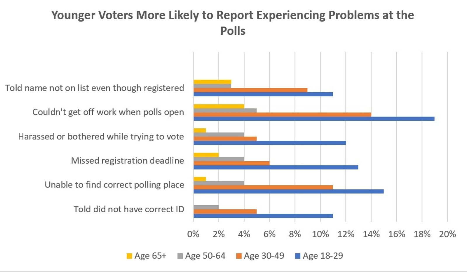 Younger voters, those age 18-29, also reported experiencing problems at a much higher rate than other age groups the last time they tried to vote.