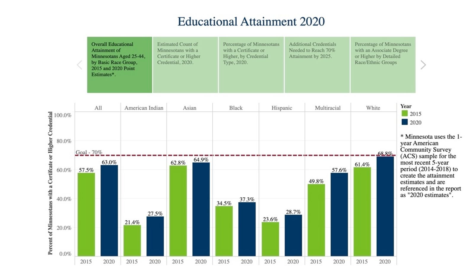 The Minnesota P-20 Education Partnership was created in 2009 to build a seamless system of education from early childhood through K-12 and into post-secondary. Last year, it focused on the state’s goal of assuring that 70% of Minnesotans ages 25-44 attain a post-secondary credential by 2025, within racial/ethnic groups. The goal is centered around equity and ensuring that young Minnesotans have access to high-quality education and career options.